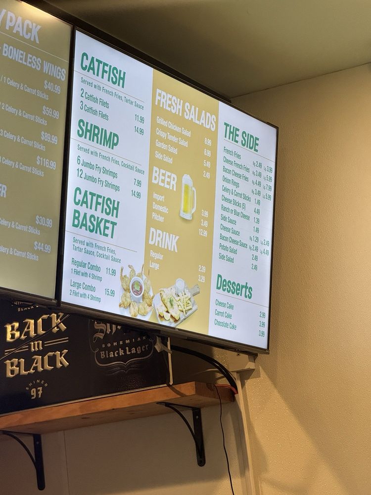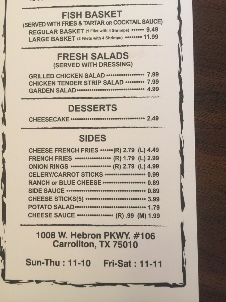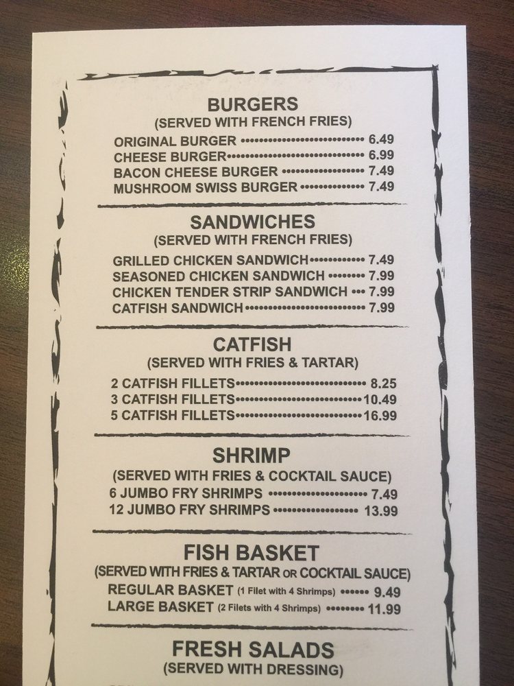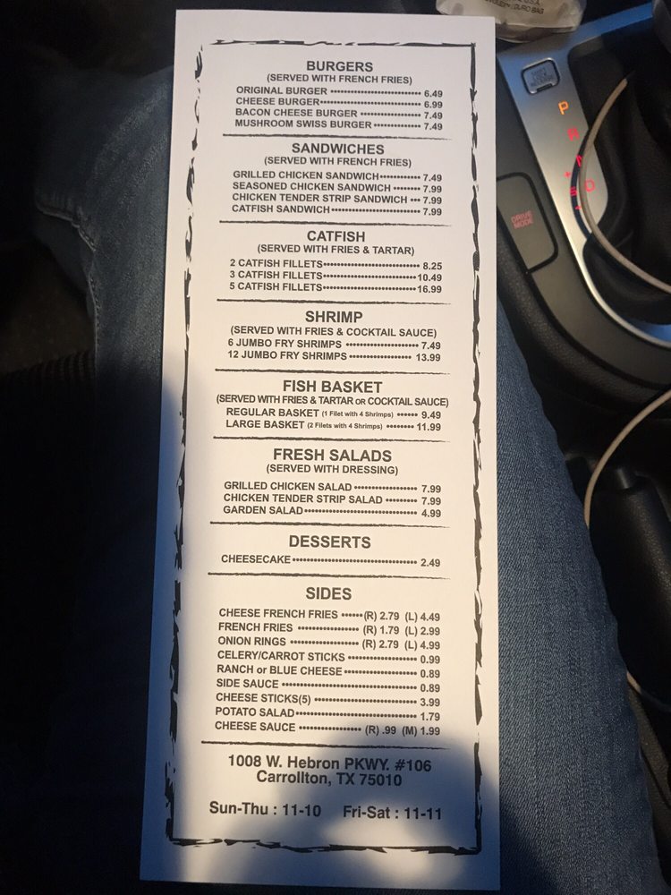 Comes with 2 catfish fillets, 4 shrimp, fries, tartar, and cocktail sauce.