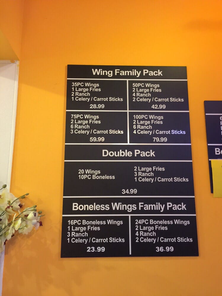 Comes with 2 large fries, 2 celery or carrot sticks, 4 ranch, and 4 flavors.